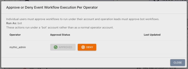 Every time an operation is created, a “bot” account is also created and added to the operation as a standard “operator”. More detail on the accounts can be found here. The default operational context for a workflow is the “bot” account for the operation. However, we don’t want just anybody to upload workflows to do arbitrary things within Mythic. That could get dangerous. Instead, anybody can upload the workflow files, but if the execution context is for the bot, then the admin of the operation must approve it to run.