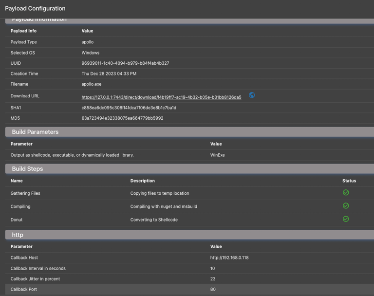 In the Mythic UI, you’ll see blue globe icons that open prompts to host those files via any C2. For example, looking at the Payload’s table and clicking the information icon you’ll see something like the following:
