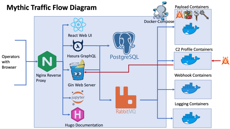 When you clone down the Mythic repo, runmake to generate the mythic-cli binary, and then run sudo ./mythic-cli start, you are creating a docker-compose file automatically that references a bunch of Dockerfile in the various folders within the Mythic folder. These folders within Mythic are generally self-explanatory for their purpose, such as postgres-docker , rabbitmq-docker, mythic-docker, and MythicReactUI.