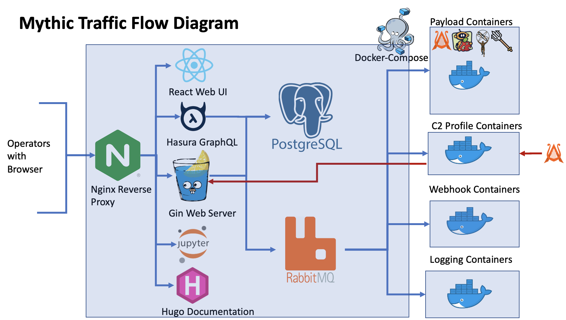 Mythic is a multiplayer, command and control platform for red teaming operations. It is designed to facilitate a plug-n-play architecture where new agents, communication channels, and modifications can happen on the fly. Some of the Mythic project’s main goals are to provide quality of life improvements to operators, improve maintainability of agents, enable customizations, and provide more robust data analytic capabilities to operations. Fundamentally, Mythic uses a web-based front end (React) and Docker containers for the back-end. A GoLang server handles the bulk of the web requests via GraphQL APIs and WebSockets. This server then handles connections to the PostgreSQL database and communicates to the other Docker containers via RabbitMQ. This enables the individual components to be on separate physical computers or in different virtual machines if desired. A helpful view of the current state of the C2 Profiles and Agents for Mythic can be found here:Mythic Community Overview