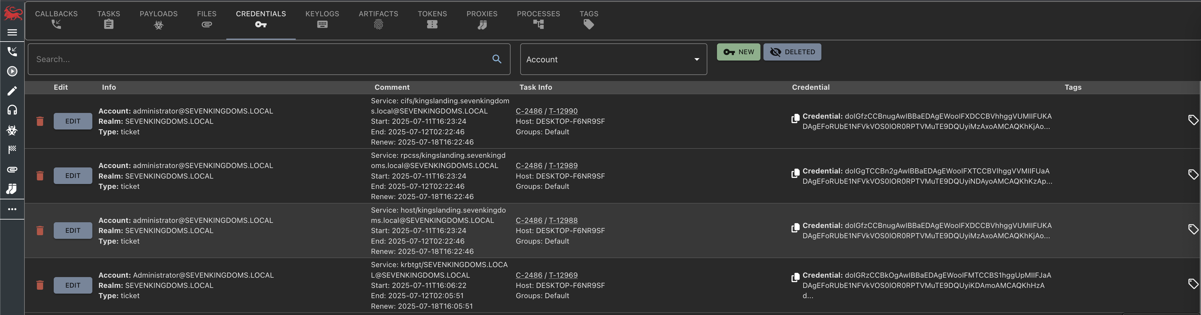 As part of command output, credentials can be registered automatically if the agent parses out the material. Otherwise, users can also manually register credentials. There are a few pieces of information required:
