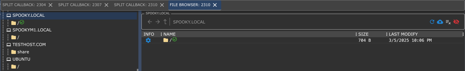 listbutton. This looks for a command withfile_browser:listset in the command’s supported_ui_features loaded into the callback identified at the top of the tab. Then issues that command with thehostandpathshown in the first two fields. If you want to list the contents of a directory that you can’t see in the UI, just modify these two values and hitlist. - The second button is the