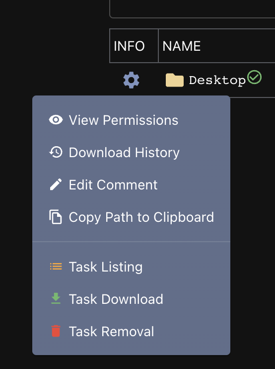 The view is divided into two pieces - a graphical hierarchy on the left and a more detailed view of a folder on the right. The top layer on the left will be the hostname and everything below it will correspond to the file structure for that host. You’ll notice a green checkmark for the/ folder. The green checkmark means that an agent reported back information for that folder specifically (i.e. somebody tasked an ls of that folder or issued a list command via the button on the table side). This is in contrast the other folders in that tree - those folders are “implicitly” known because we have the full path returned for the folder we did access. If there is a red circle with an exclamation point, it means that you tried to perform an ls on the directory, but it failed.