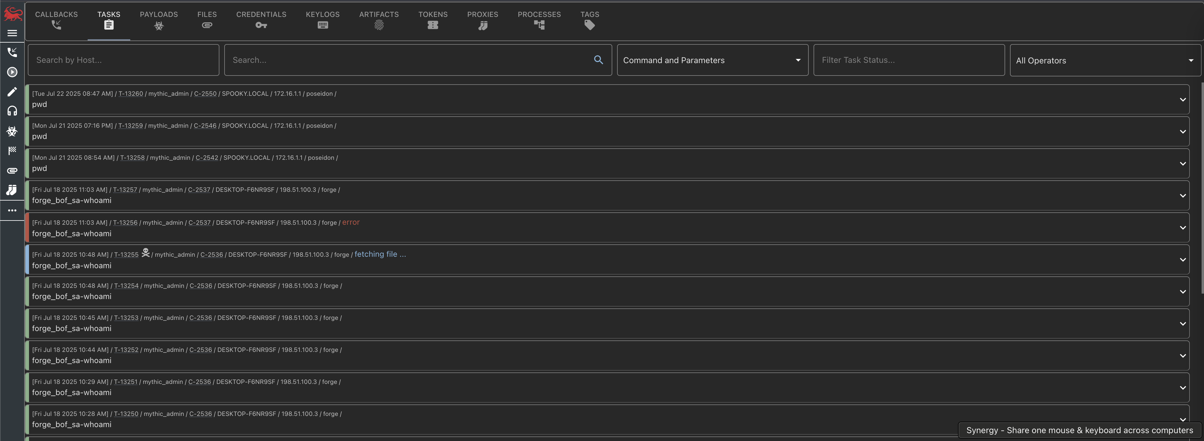 The operational search feature can be found by clicking on any the search related shortcuts. From here you can search across callbacks, tasks, files, screenshots, keylogs, tokens, artifacts, and more.How is it used?