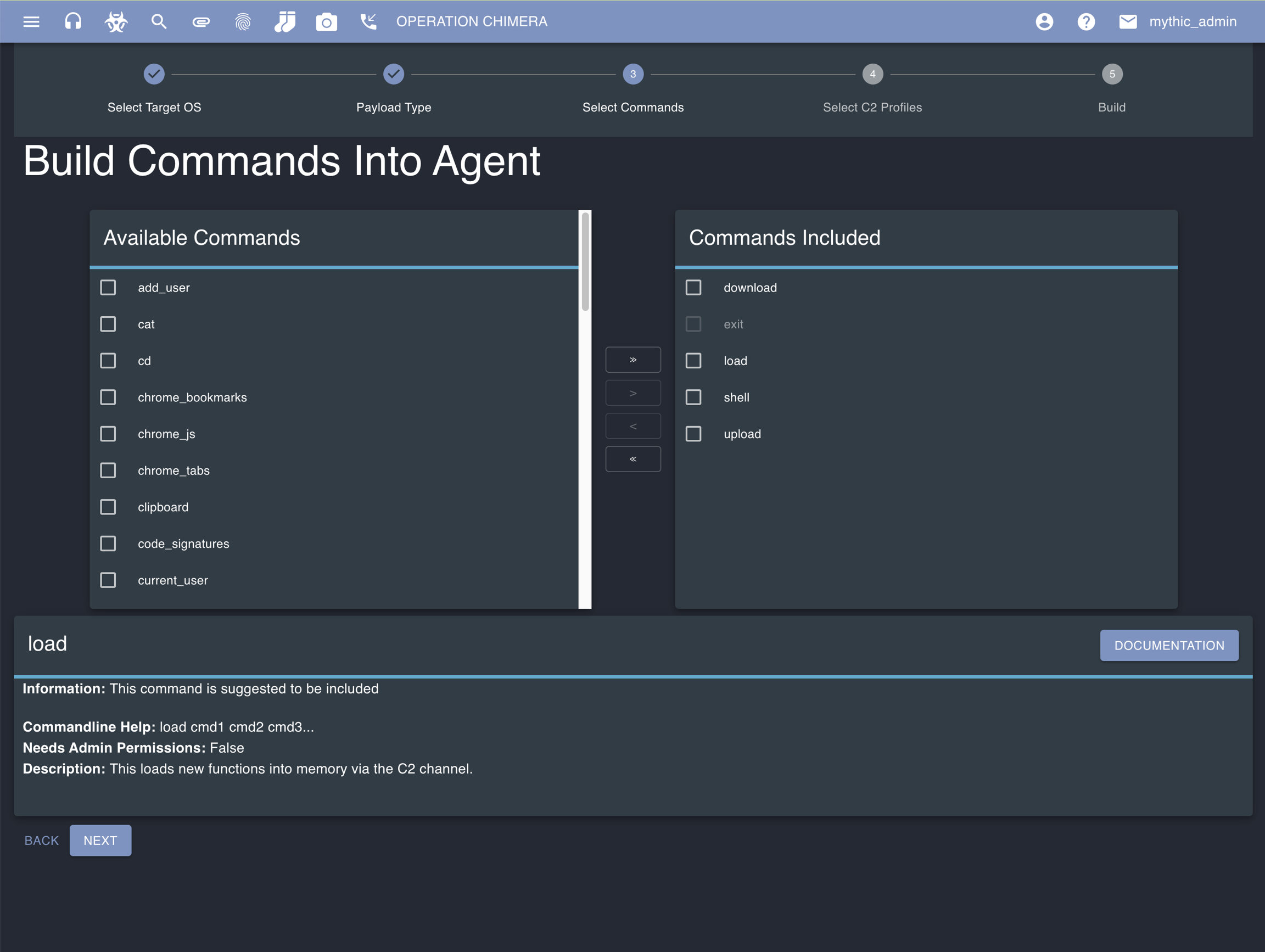 You need a payload to use. Click the hazard icon at the top and then select “New Payload” on the top right of the new screen. You can also get here by selecting the hamburger icon on the top left and selecting “Create” -> “Create Payload”. You’ll be prompted to select which operating system. This is used to filter down possible payloads to generate. Next select the payload type you’re wanting to build and fill out any necessary build parameters for the agent. Click Next. Select any commands you want stamped into the payload initially (some agents support this type of dynamic loading, some don’t). This will show commands not yet selected on the left and commands already selected on the right. There are some that might be pre-selected for you based on the agent developer (some are built in and can’t be removed, some suggested, etc). If you hover over any of the commands you can see descriptive information about them. You can potentially load commands in later, but for this walkthrough select all of them. ClickNext.