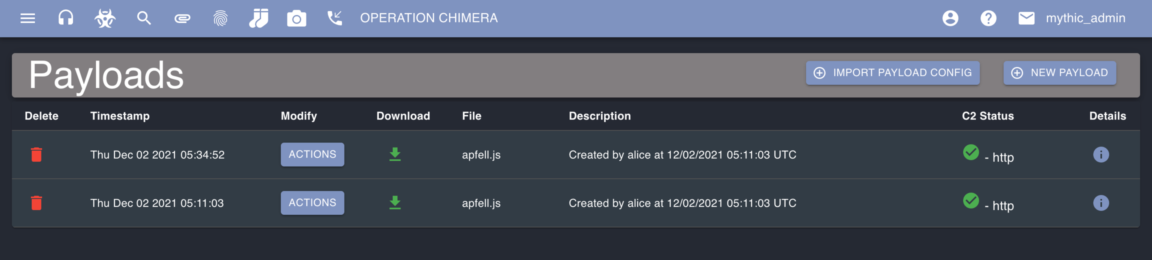 Click the hazard icon on the top again to go to the created payloads page.. This is where you’ll be able to see all of the payloads created for the current operation. You can delete the payload, view the configuration, or download the payload. For this walkthrough, download the payload (green download icon).