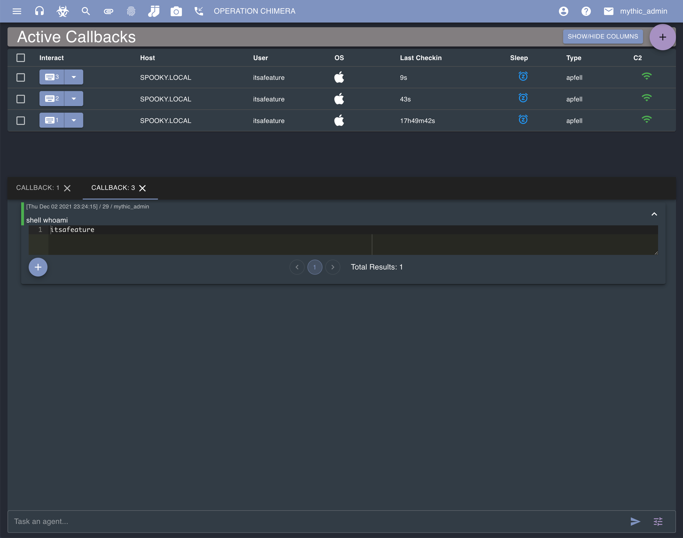 This is where you’ll be able to interact with any callback in the operation. Click the button for the row with your new agent to bring up information in the bottom pane where you can type out commands and issue them to the agent.