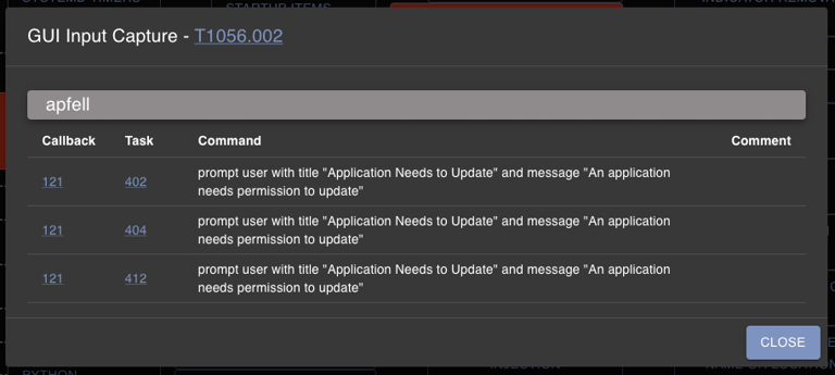Clicking the “Fetch All Commands Mapped to MITRE” action will highlight all of the matrix cells that have a command registered to that ATT&CK technique. Clicking on a specific cell will bring up more specific information on which payload type and which command is mapped to that technique. All of this information comes from the MITRE ATT&CK portion of commands.